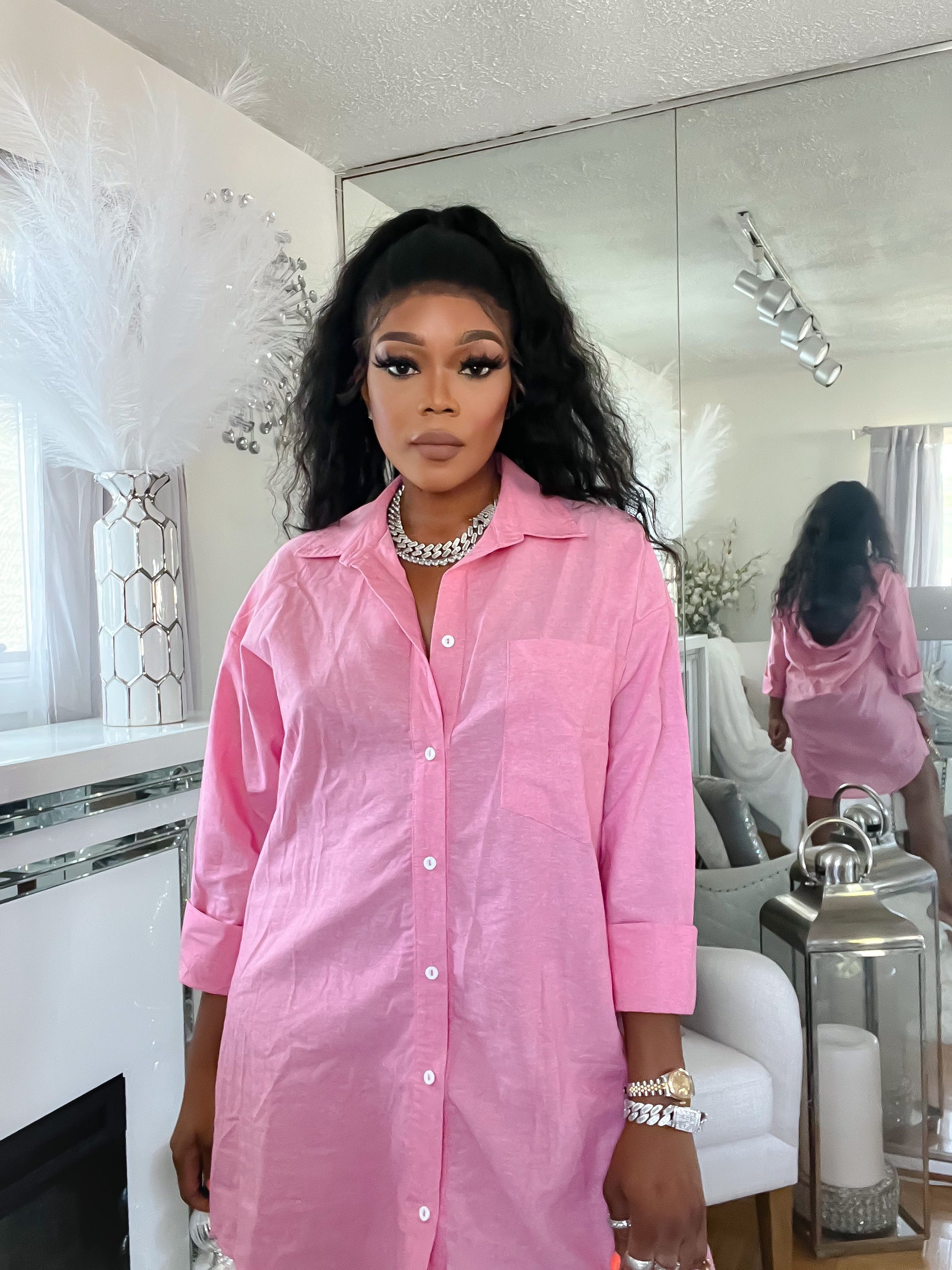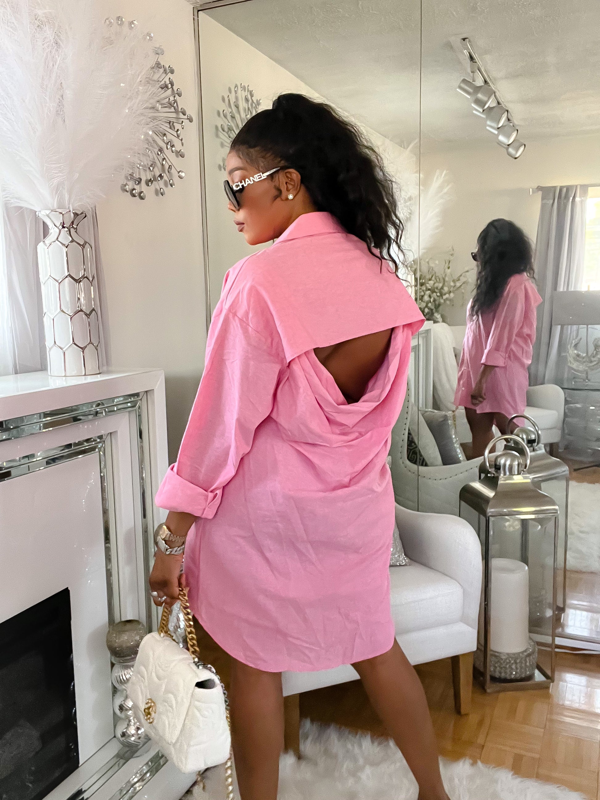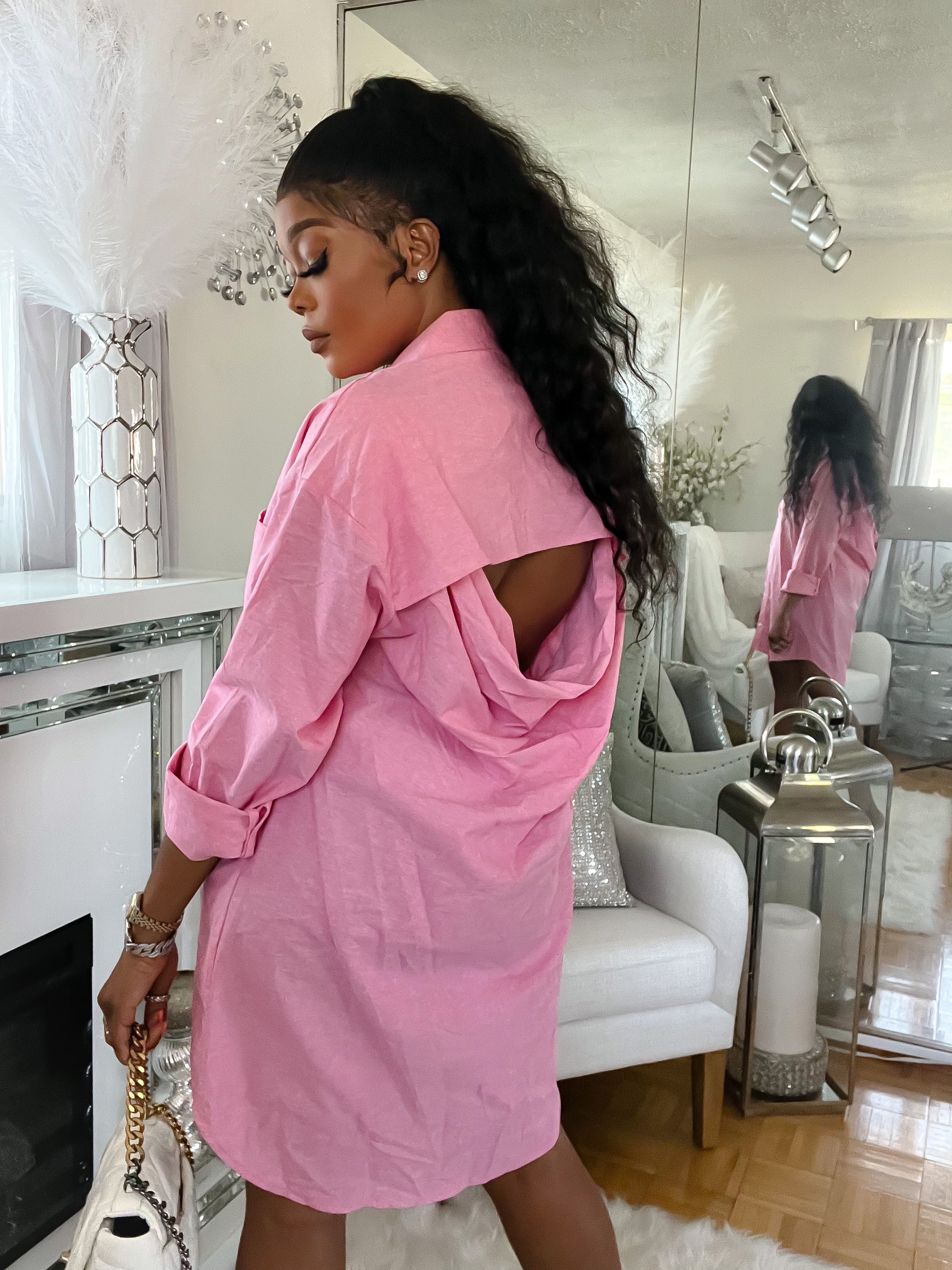 Style- long sleeve button down shirt- dress with open cowl back (relax fit)