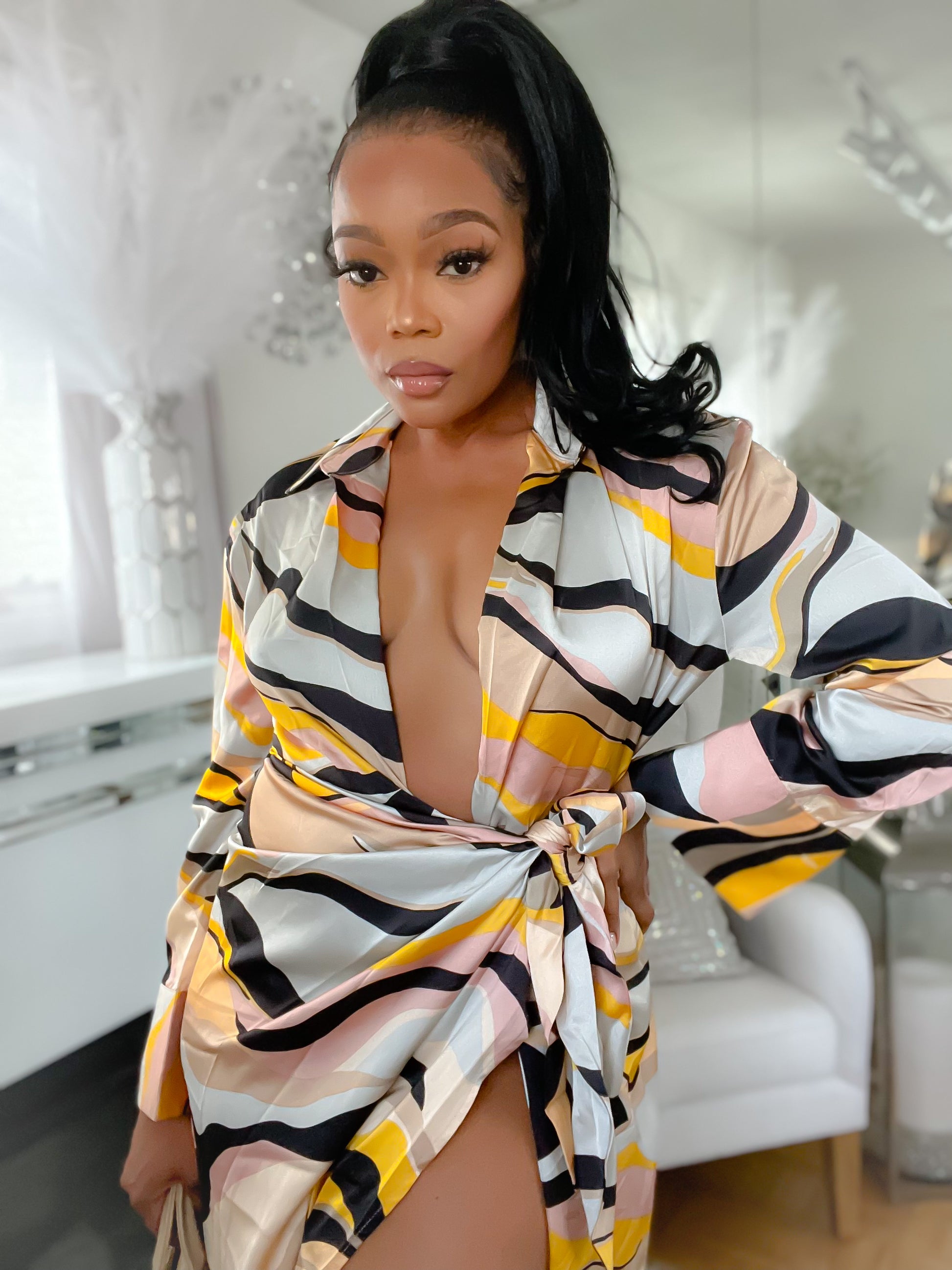the dress that can go from day to night with minimal effort on your part, day look wrap the dress by tying both inside and outside tie for more modest look, night look only tie the outside to show a little more skin.