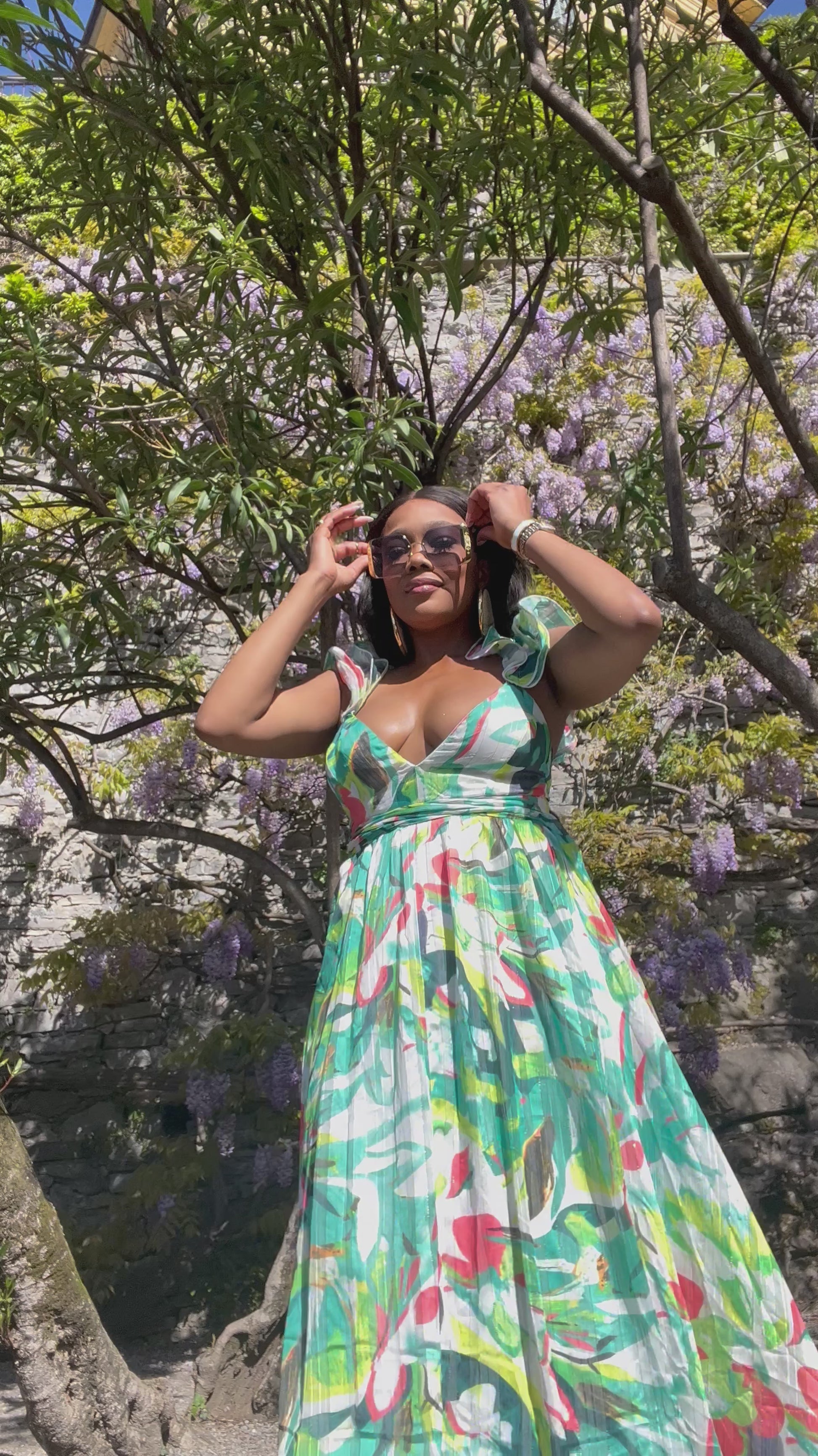 style- ruffle shoulders maxi with strappy back and zip closure