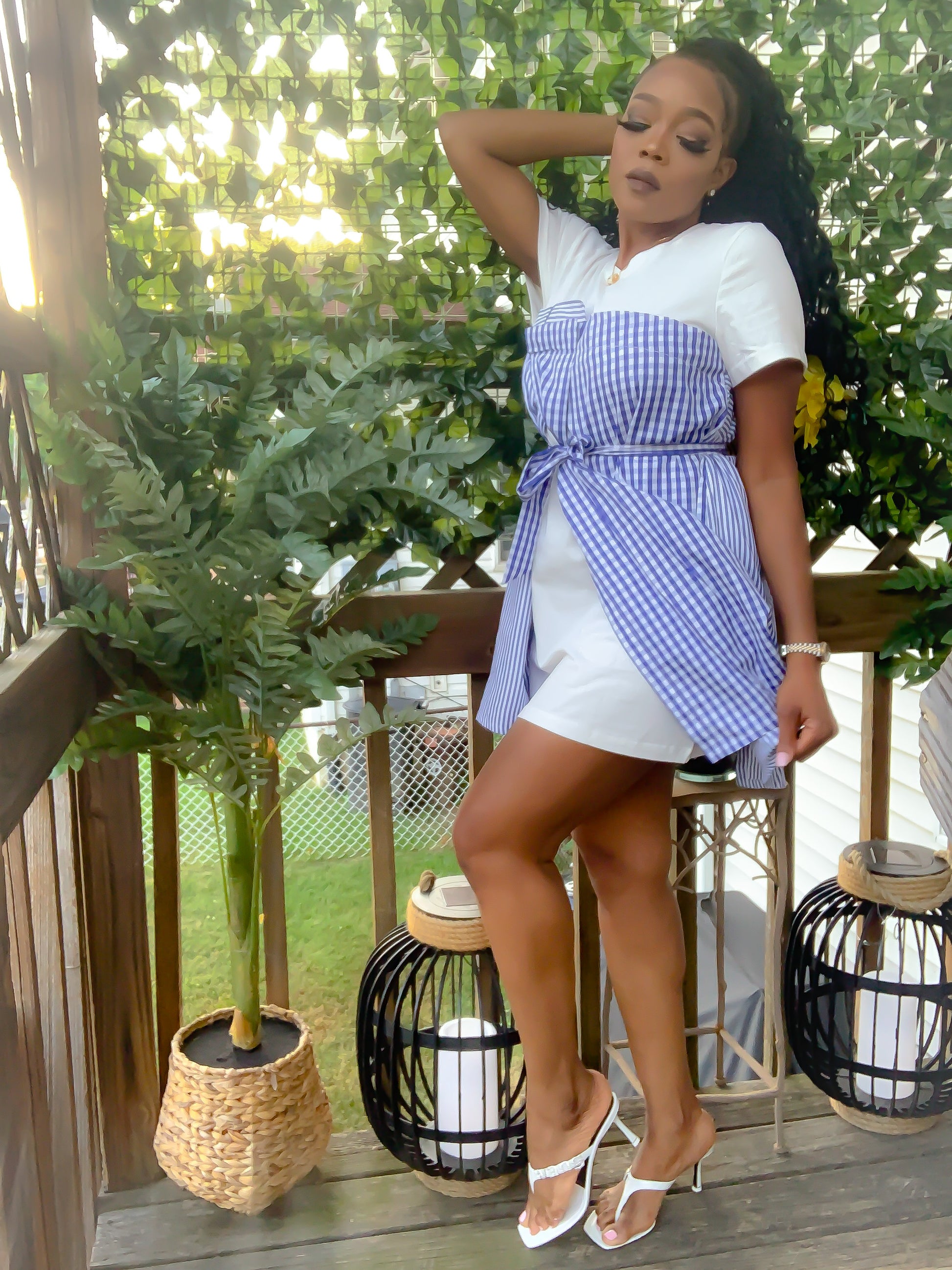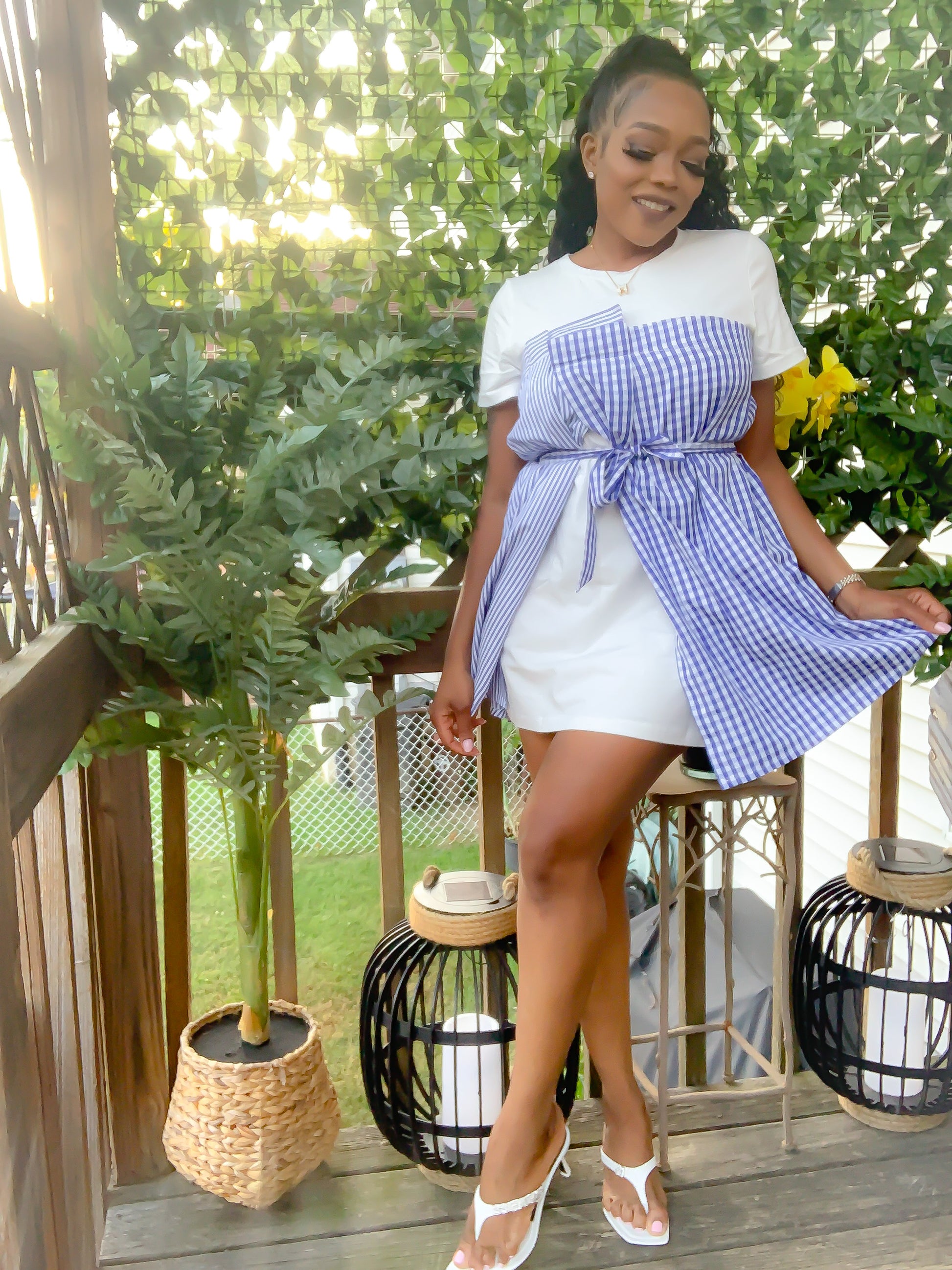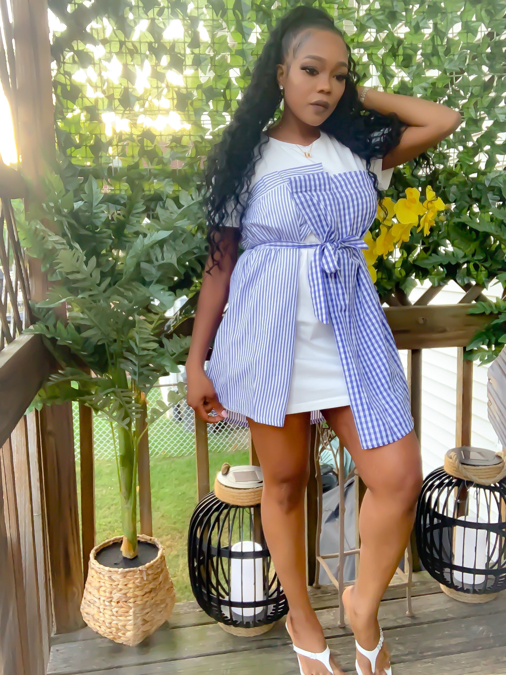 Style- T-shirt with attached pin stripe and plaid ruffle detail