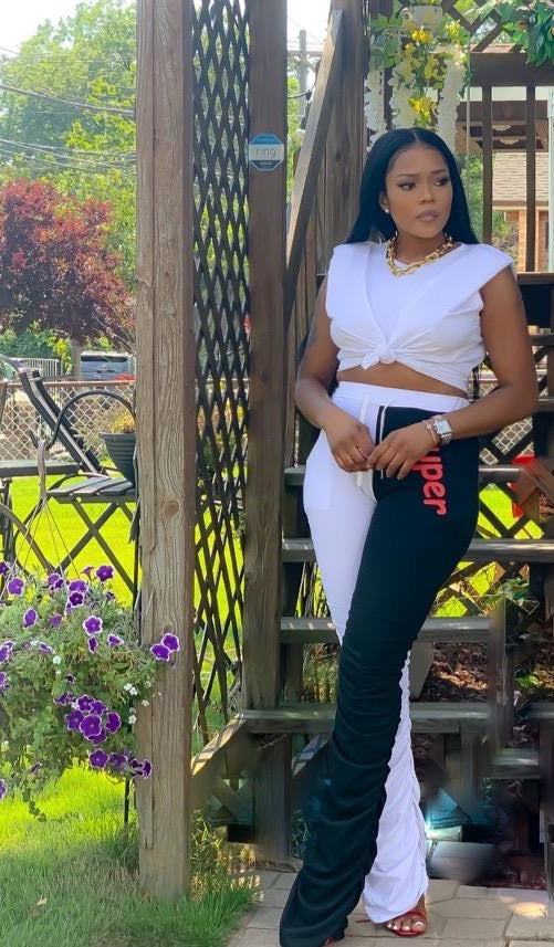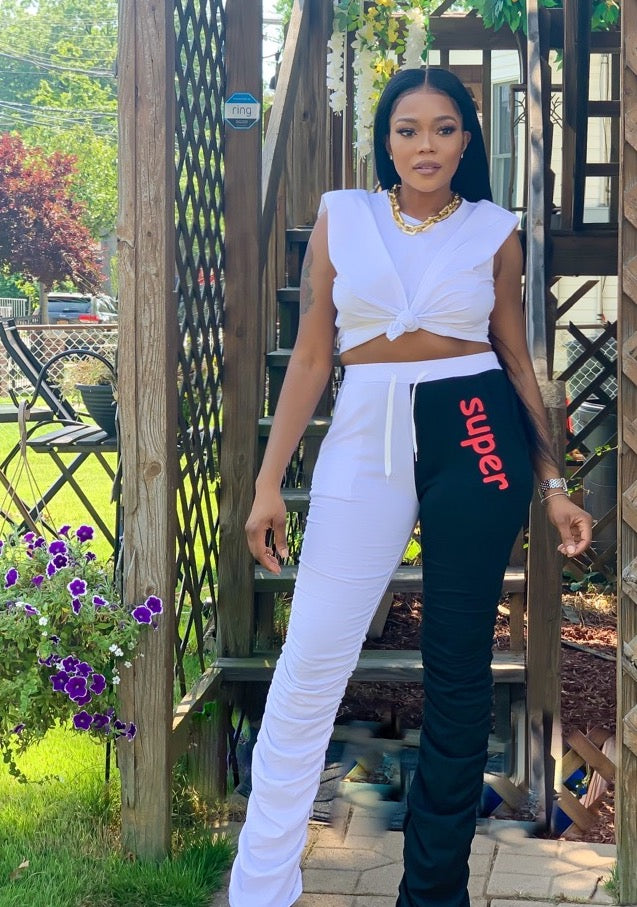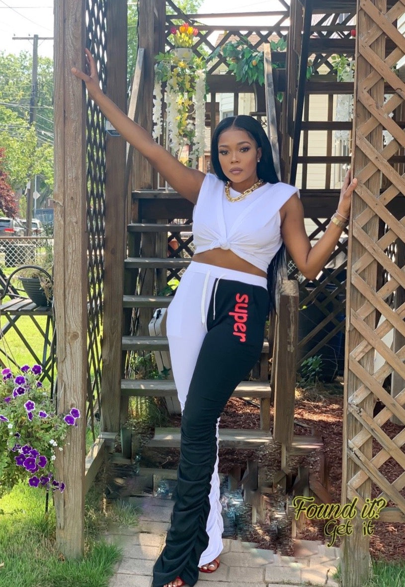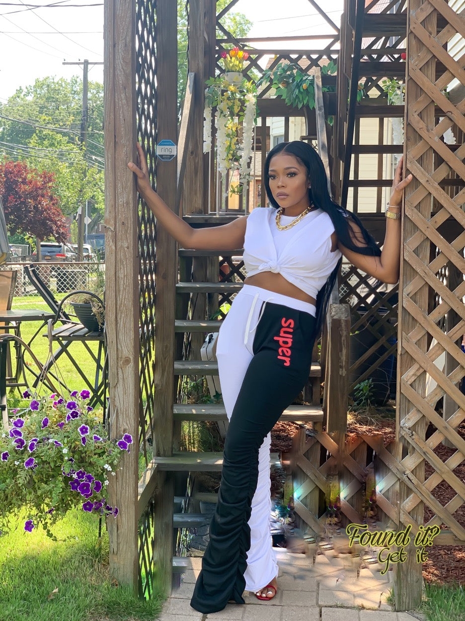Black and white joggers, features a gathered hemline for a dramatic fashion forward look and moderate stretch for the perfect curve hugging fit.
