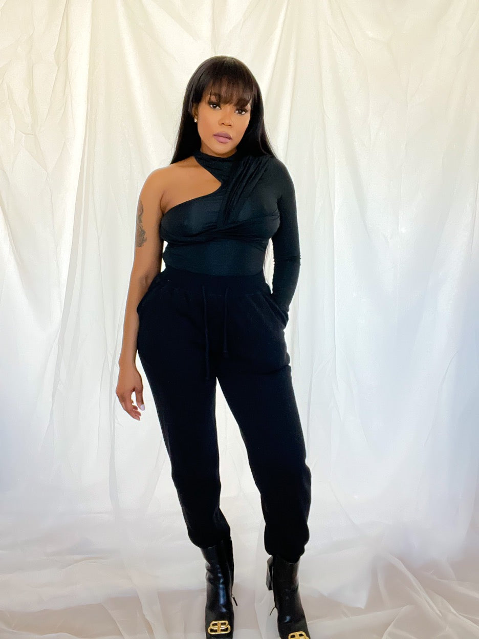 Style- one sleeve, cross tie detail bodysuit with snap closure at the crotch.