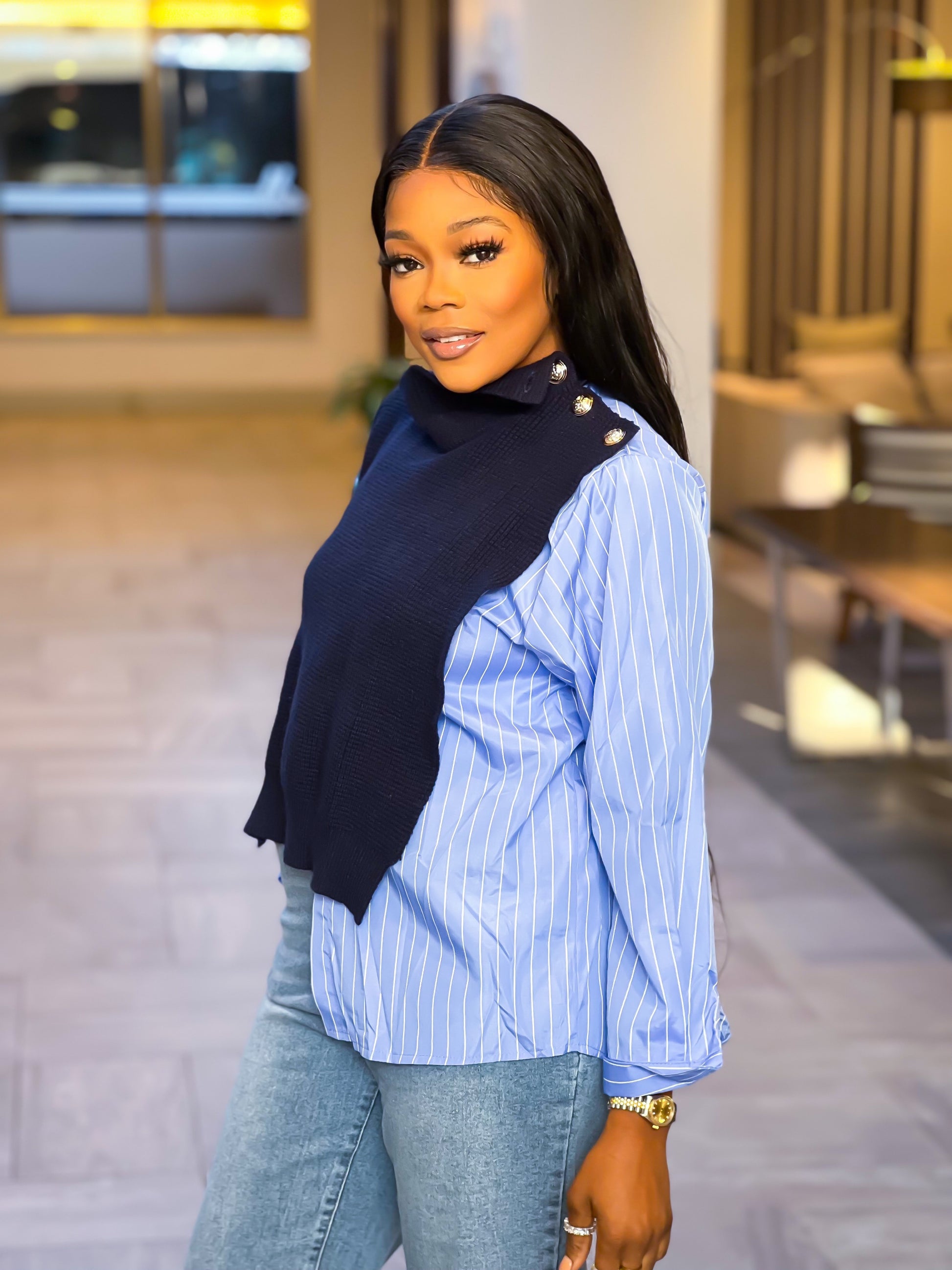 Style- pin stripe button down shirt with attached crop sweater with gold button neckline detail