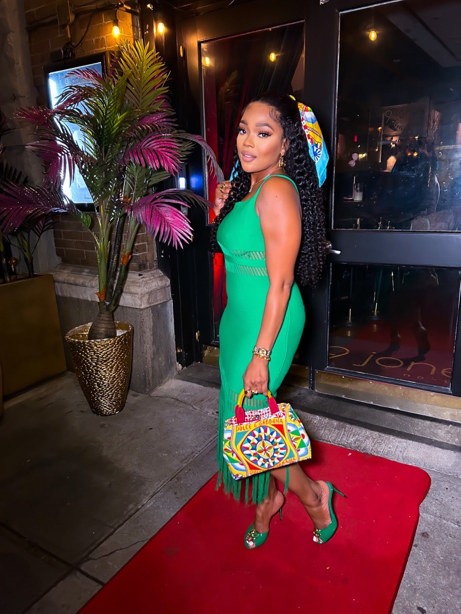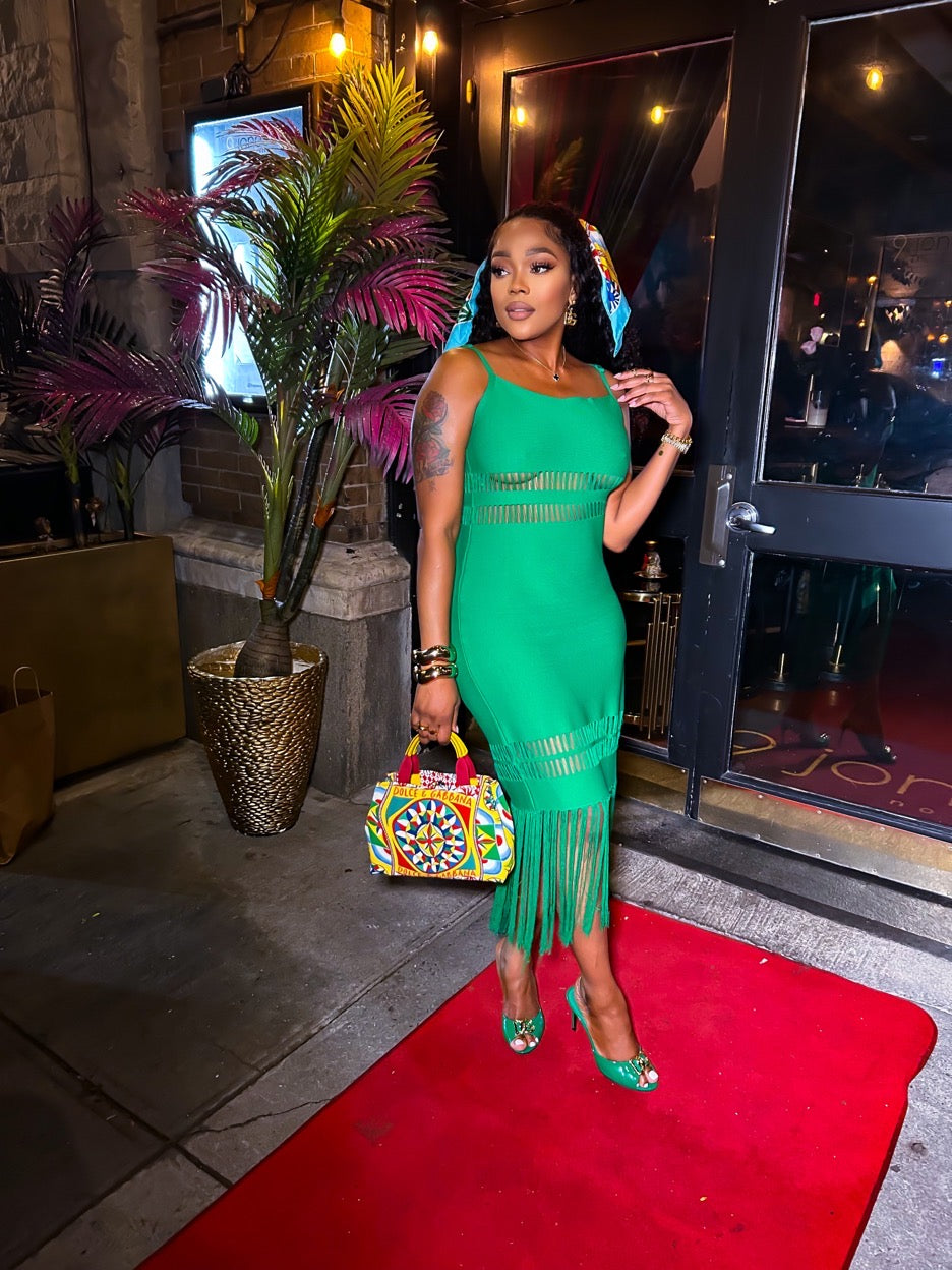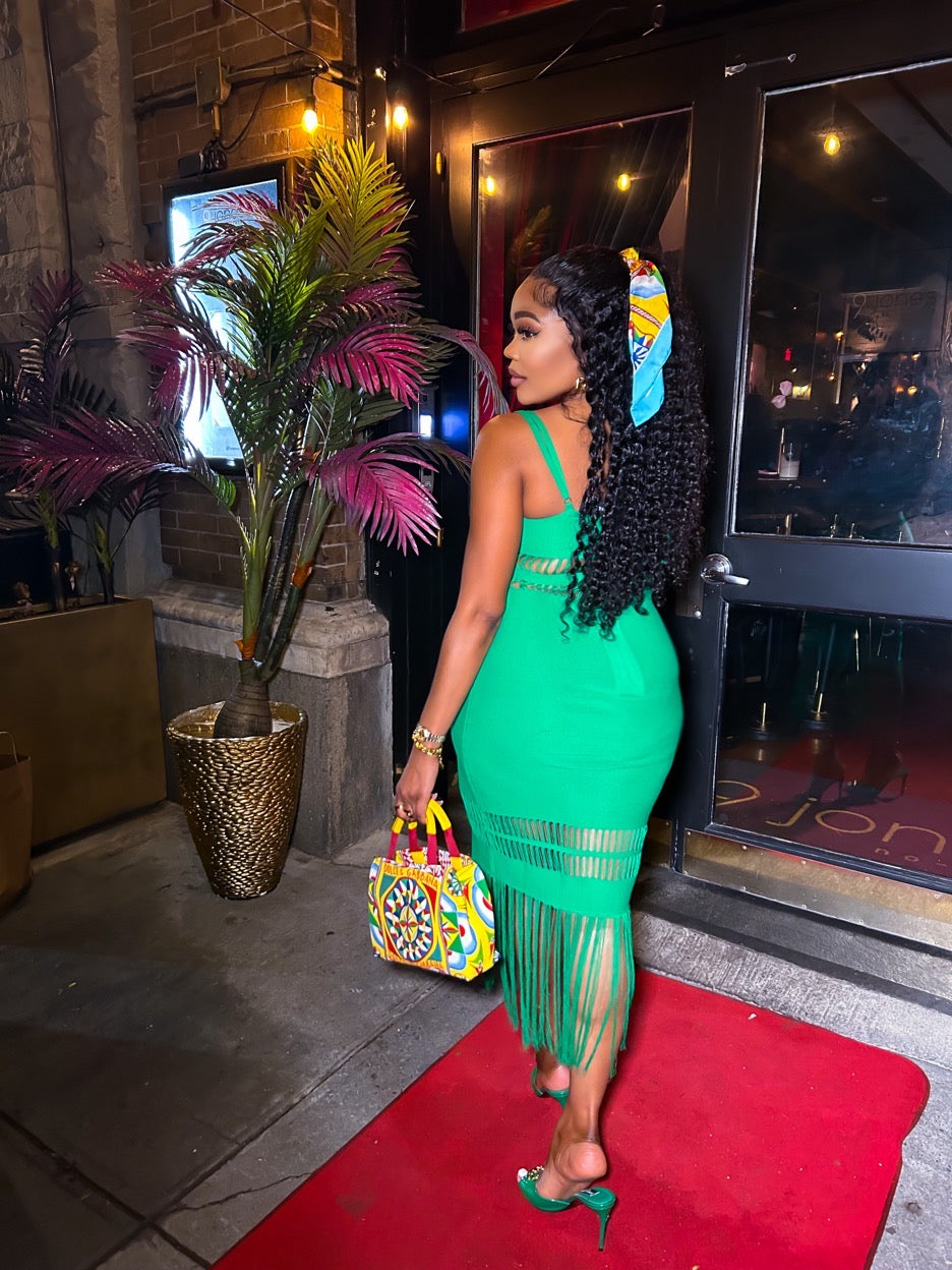 Style- bandage dress with fringe hemline and cut out details. Zip back closure