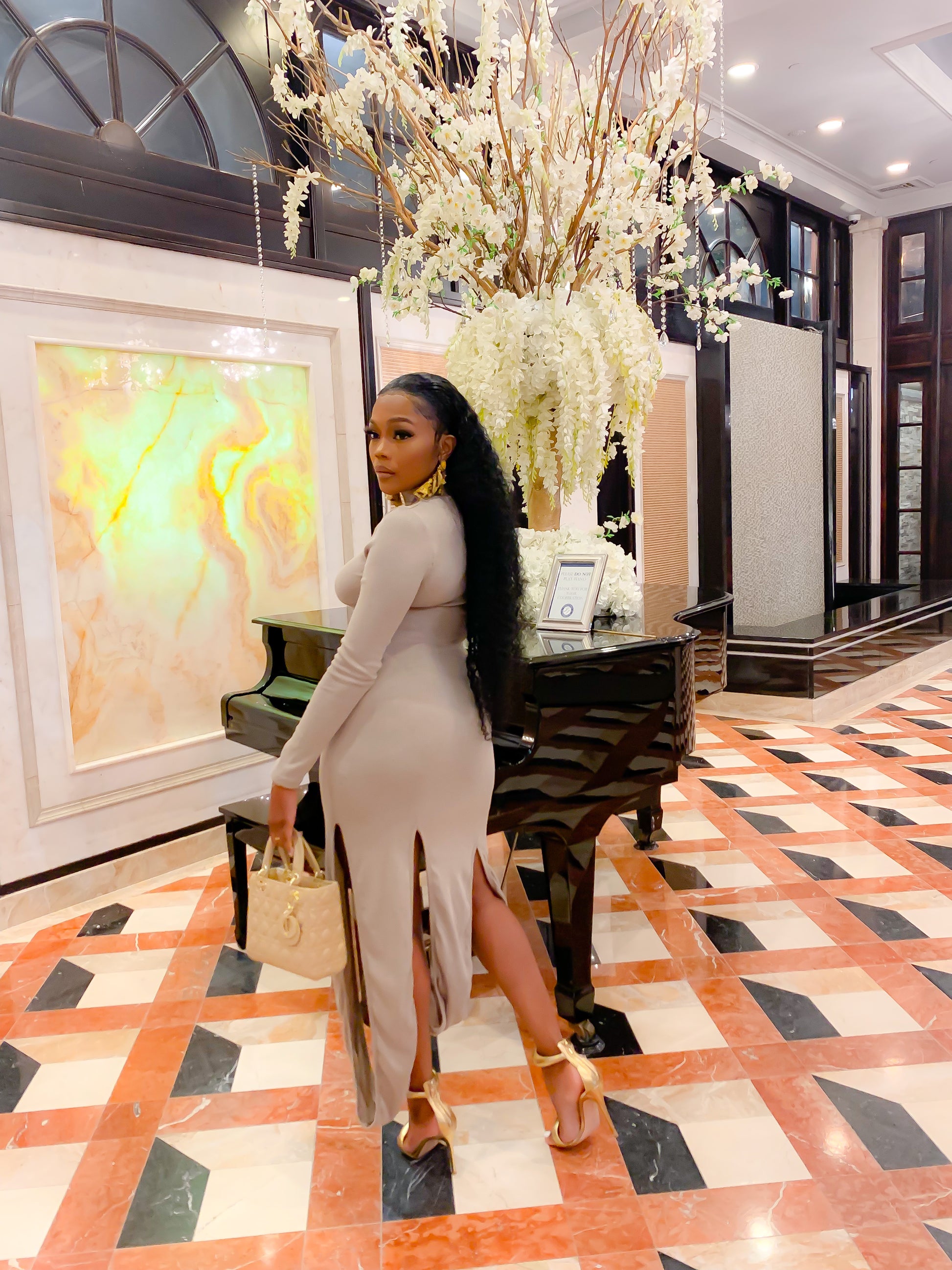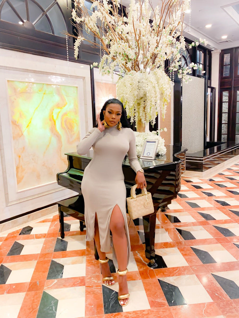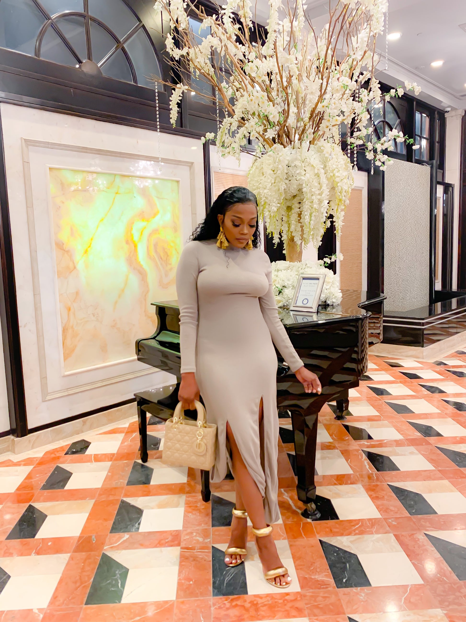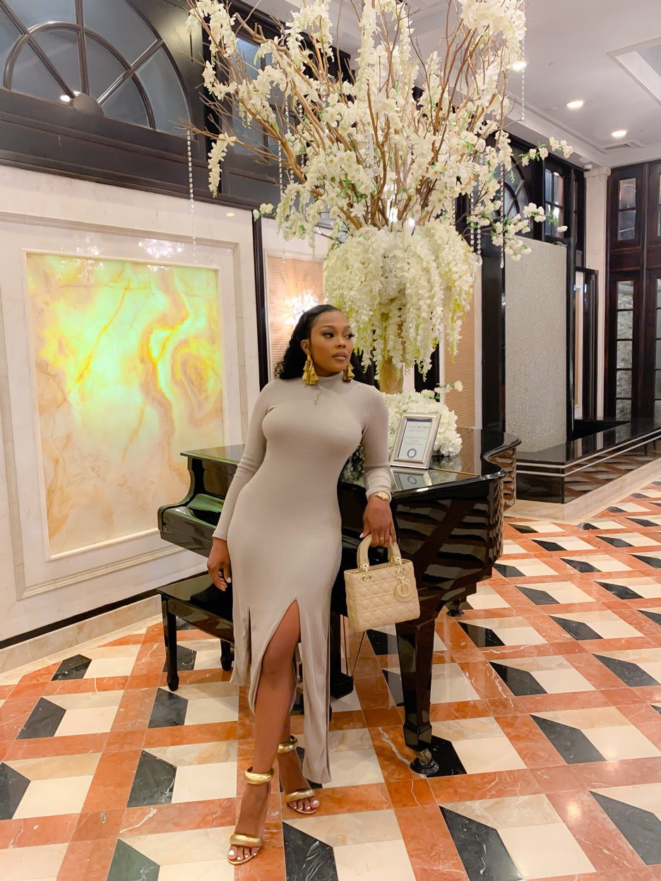 Style- mock neck, long sleeves, ribbed dress with unusual hoop hemline