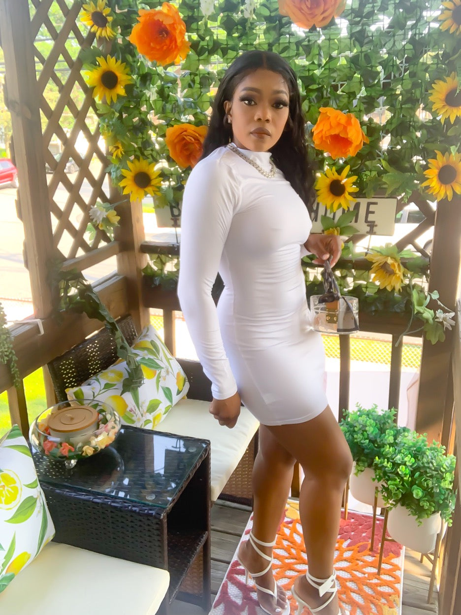 Style- mock neck, long sleeves, cut-out dress with lace up detail