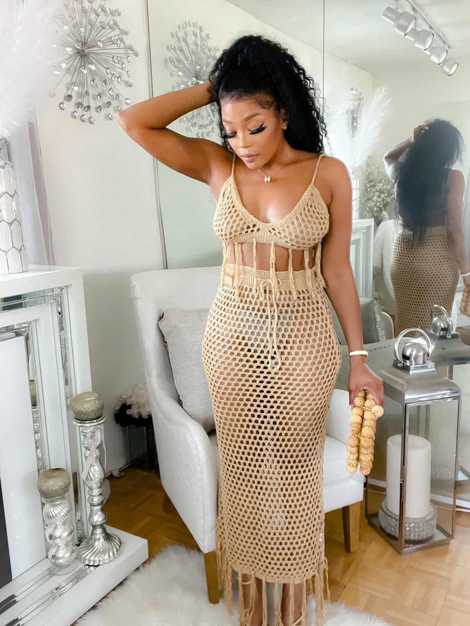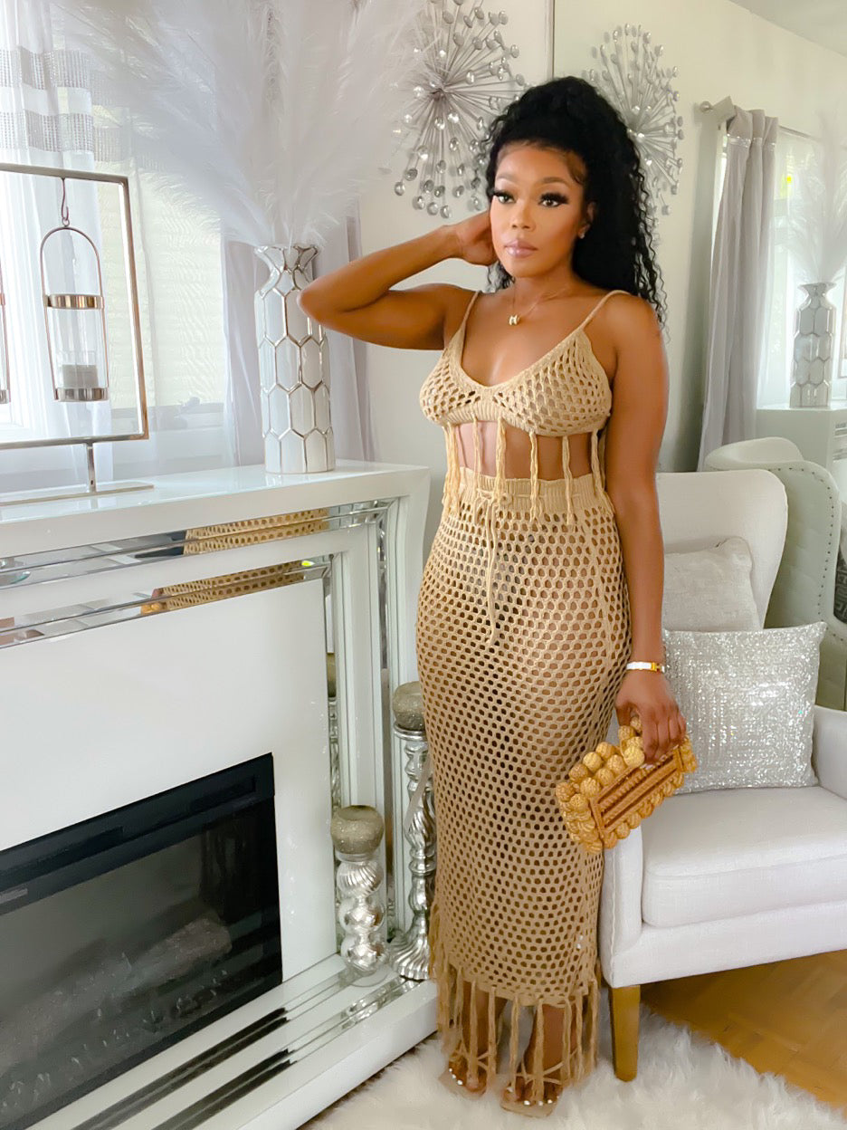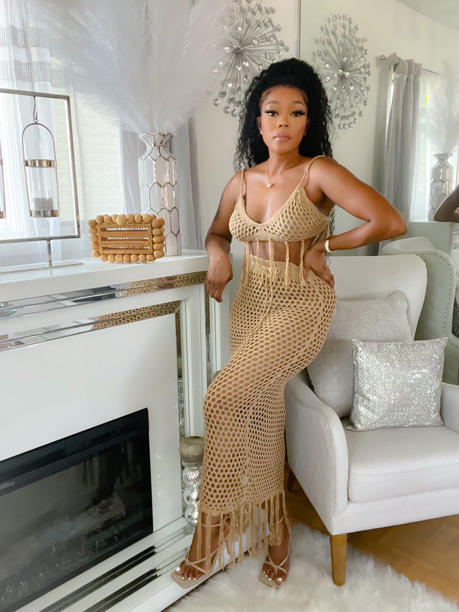 Style- Crochet two piece set with draw string waist band, tassel hem skirt and matching bralette