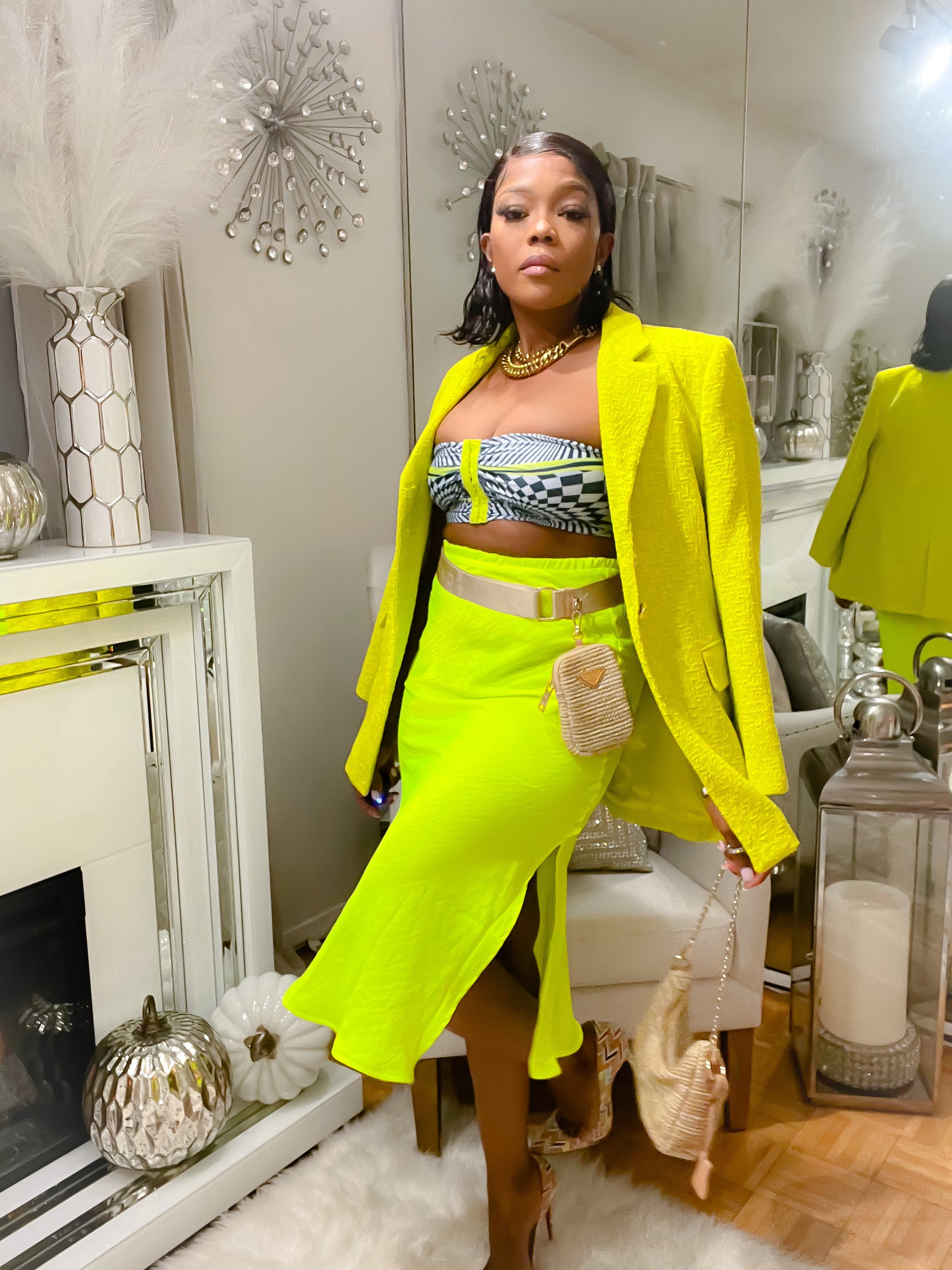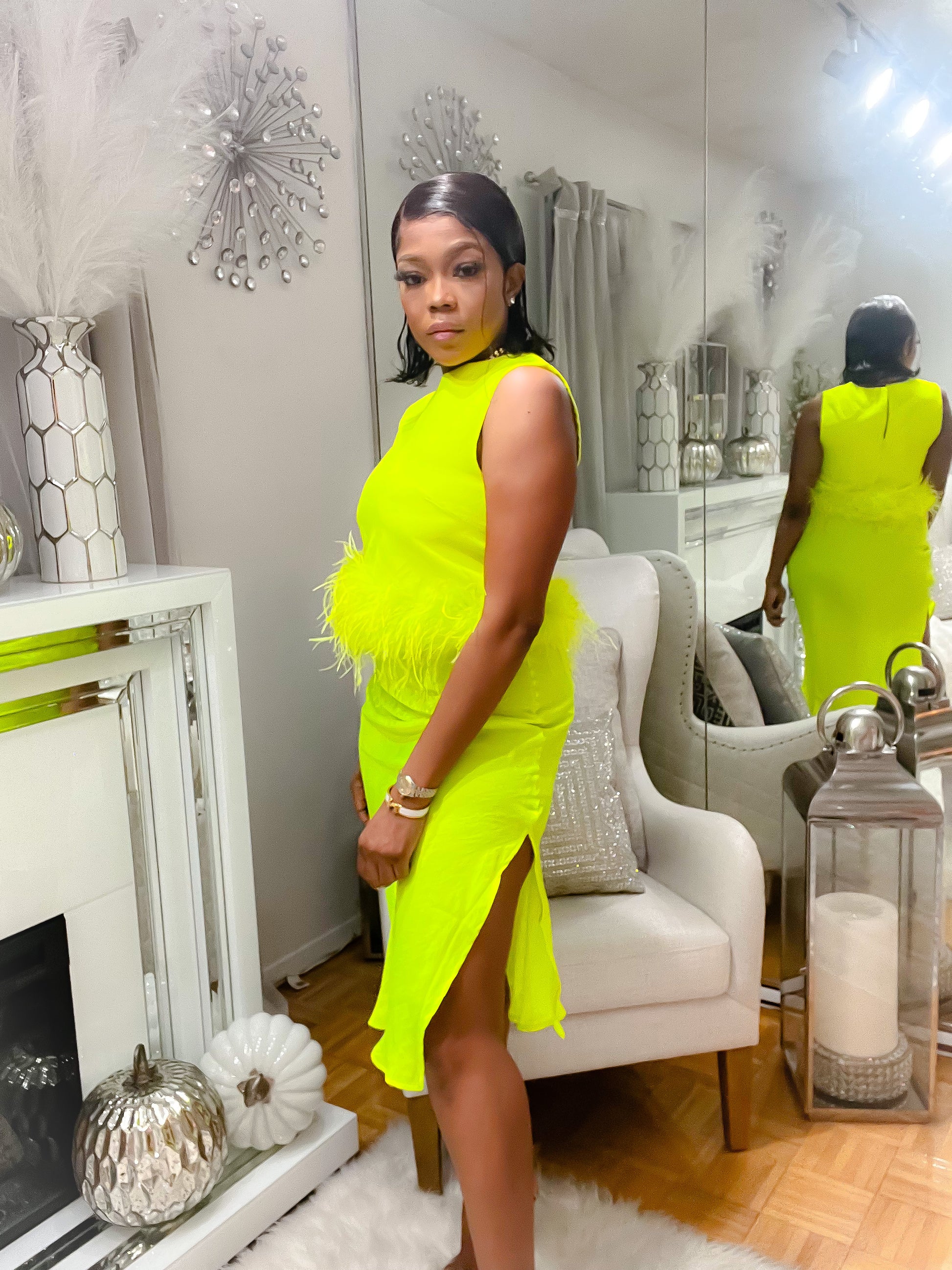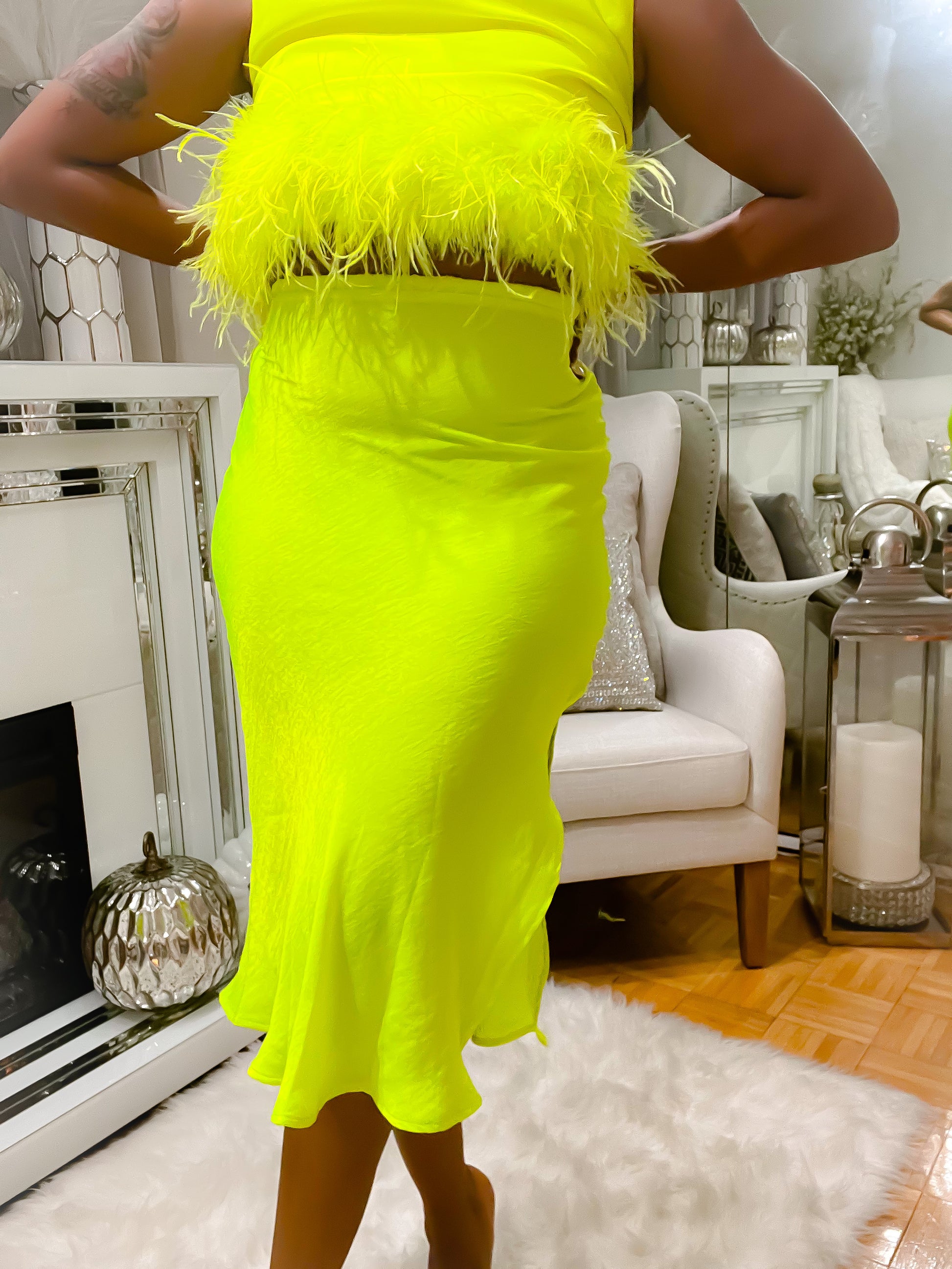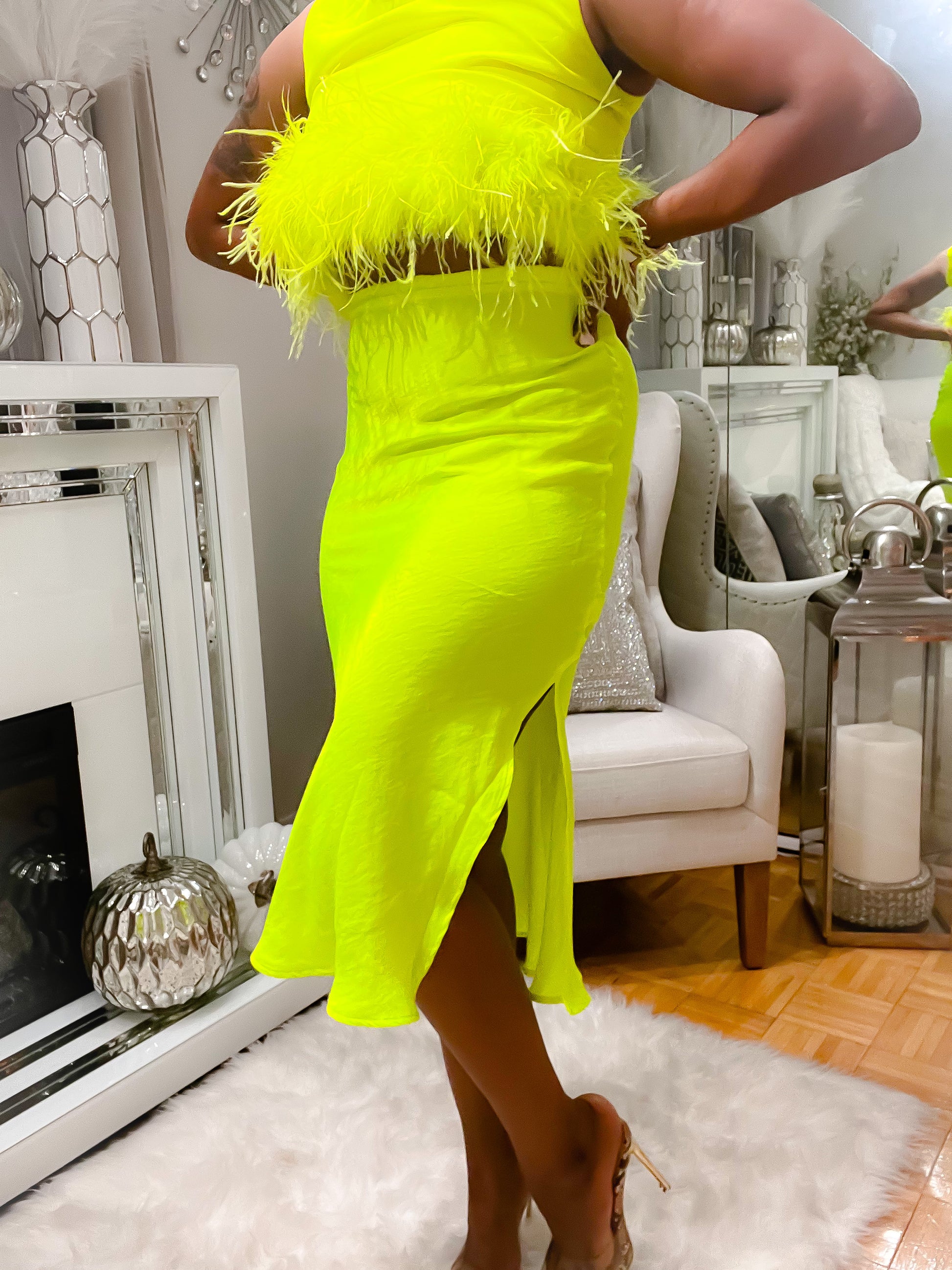 Fun fashionable and bright. The neon slip skirt is a fun piece to add to your closet. Pair with our so chic feather top