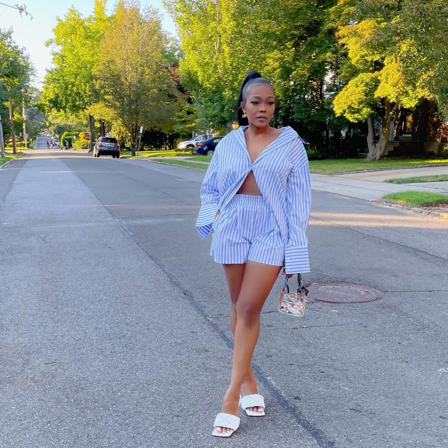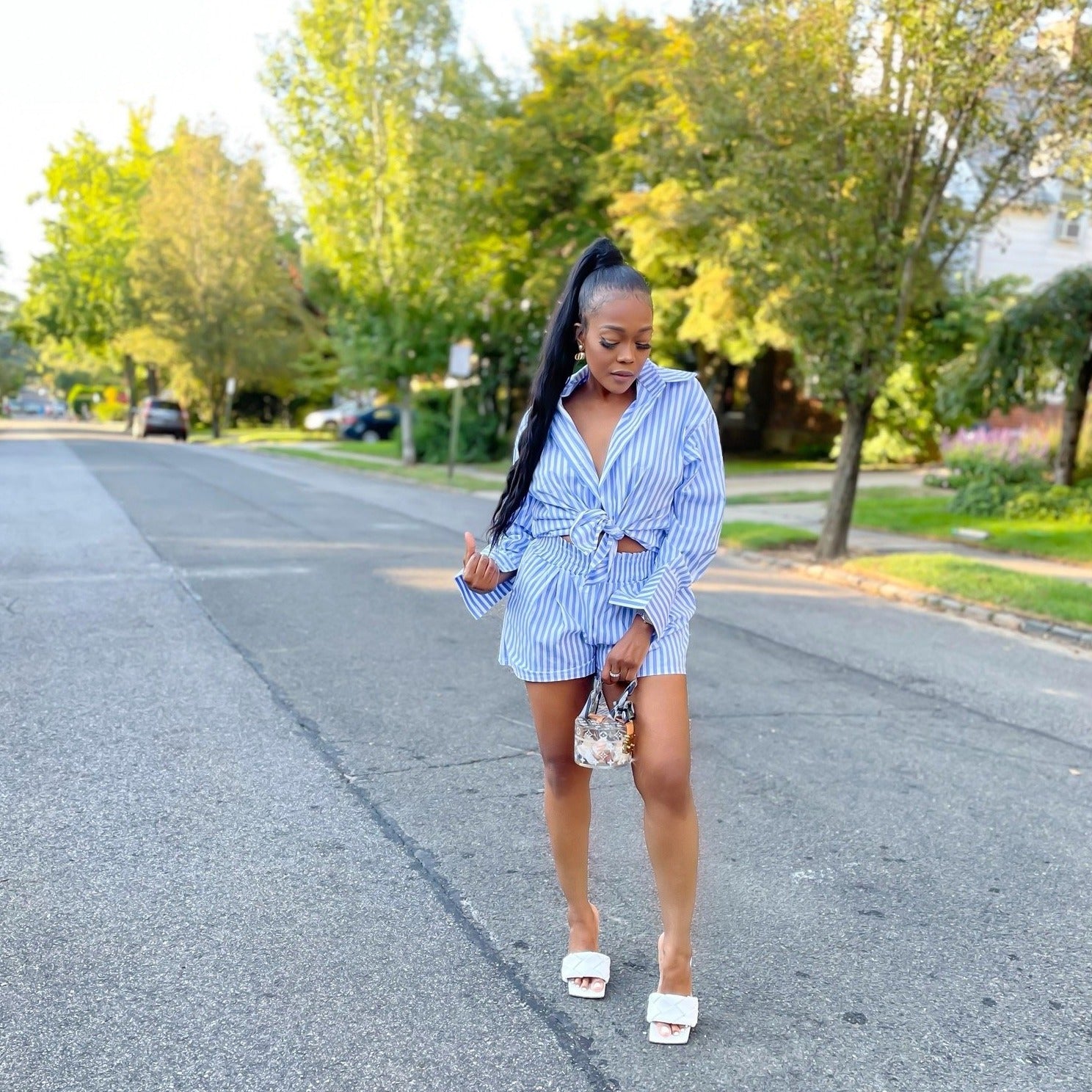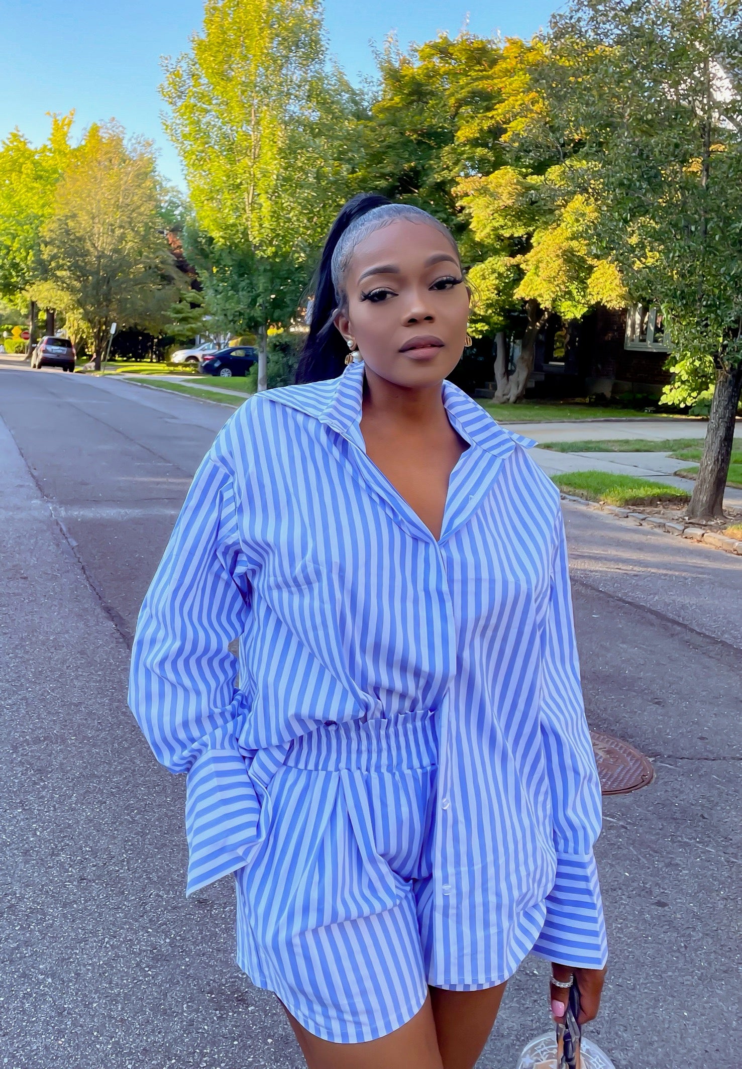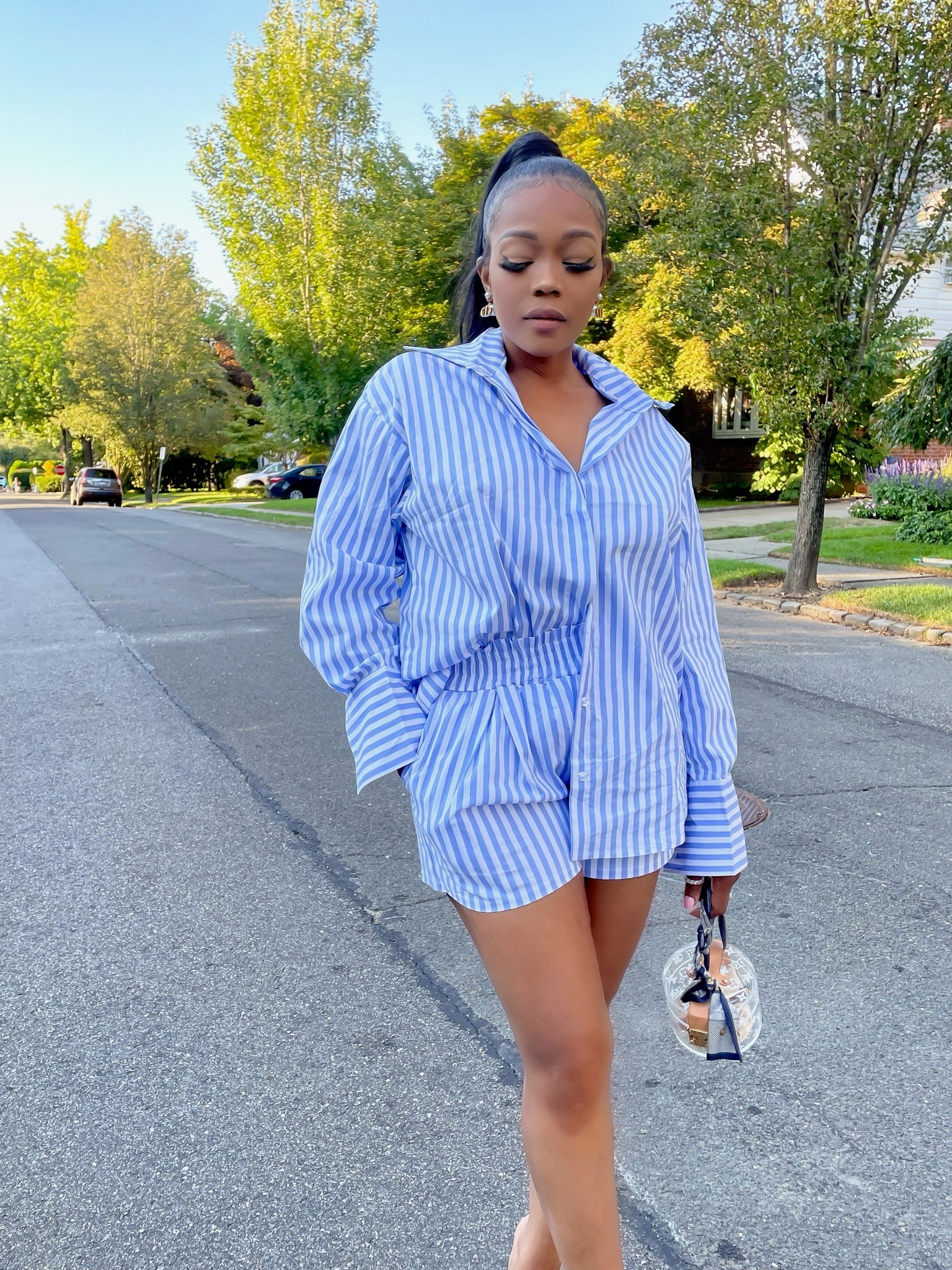Cute and comfy, the pin stripe shorts set is a great set for a casual day out or wear with heels for a night out on the town.