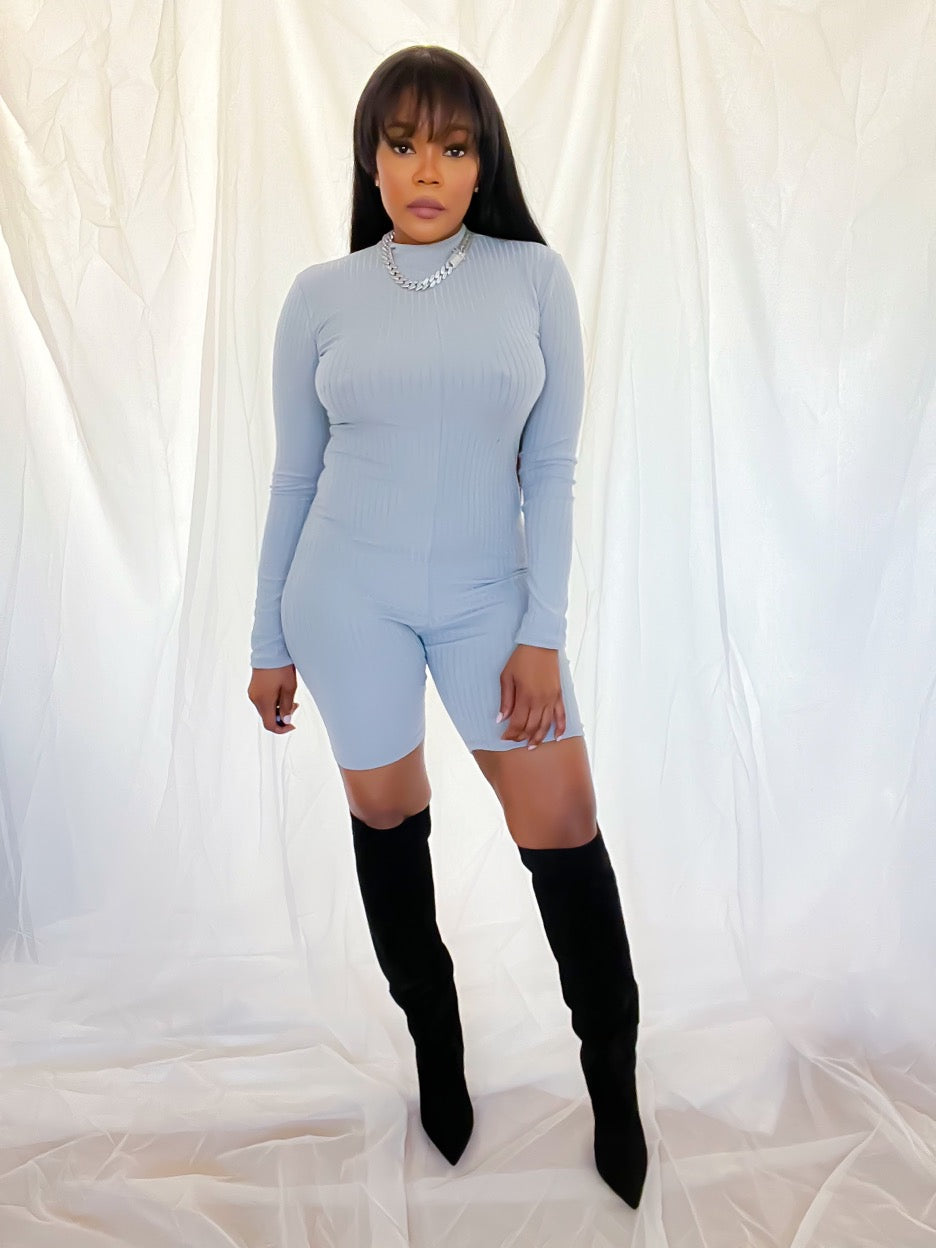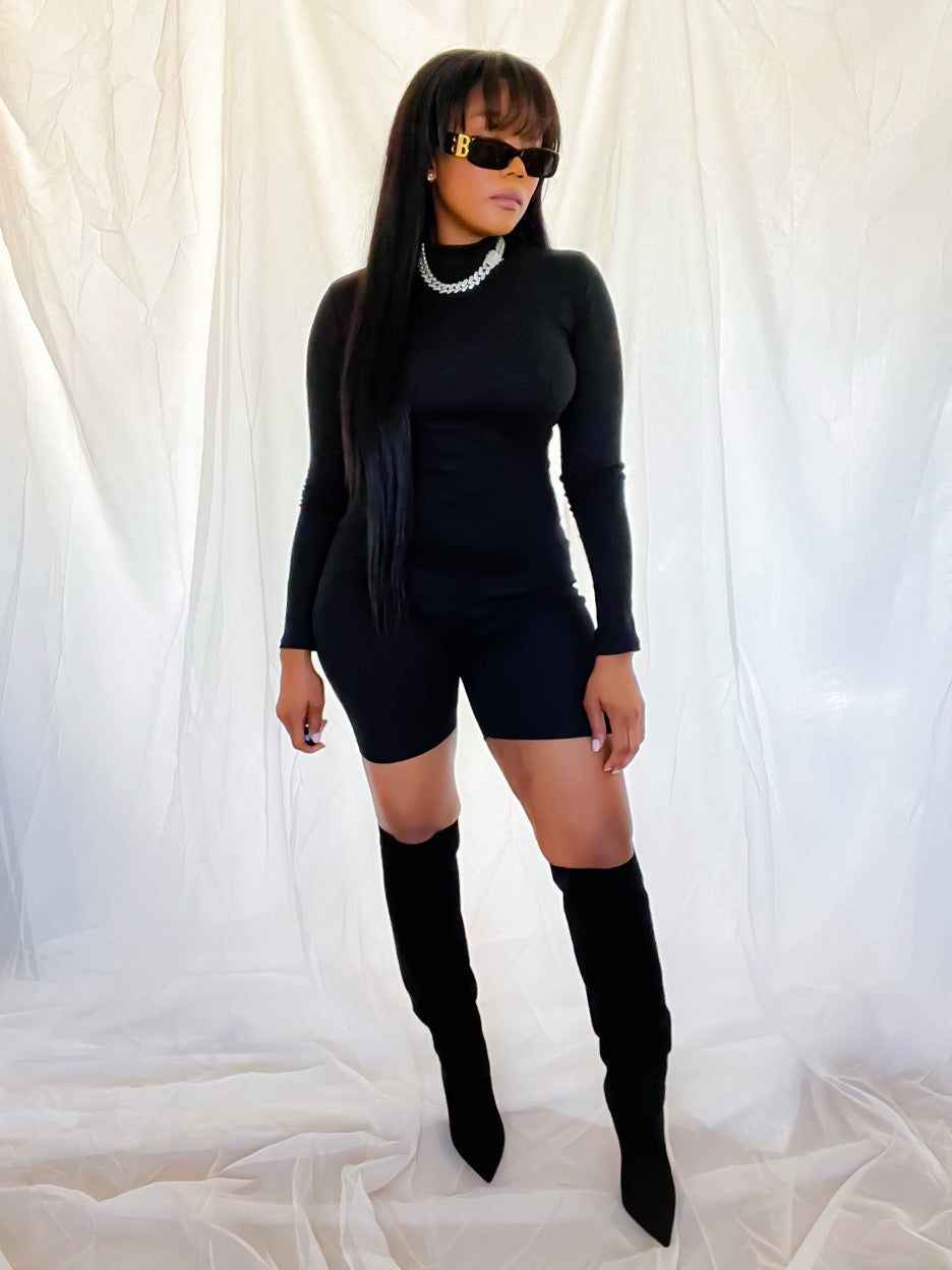 style - one piece mock neck long sleeve biker shorts romper with back zipper closure