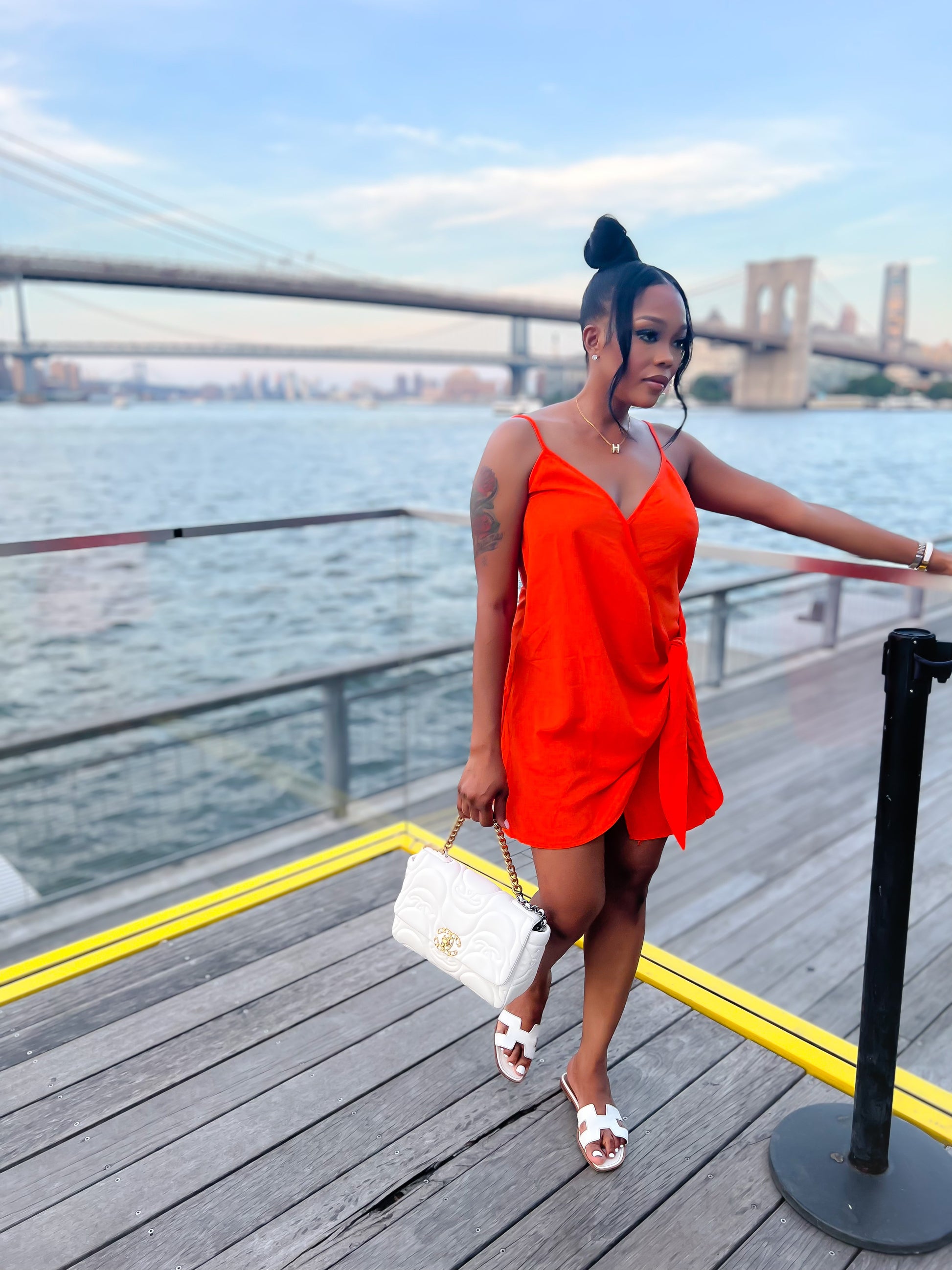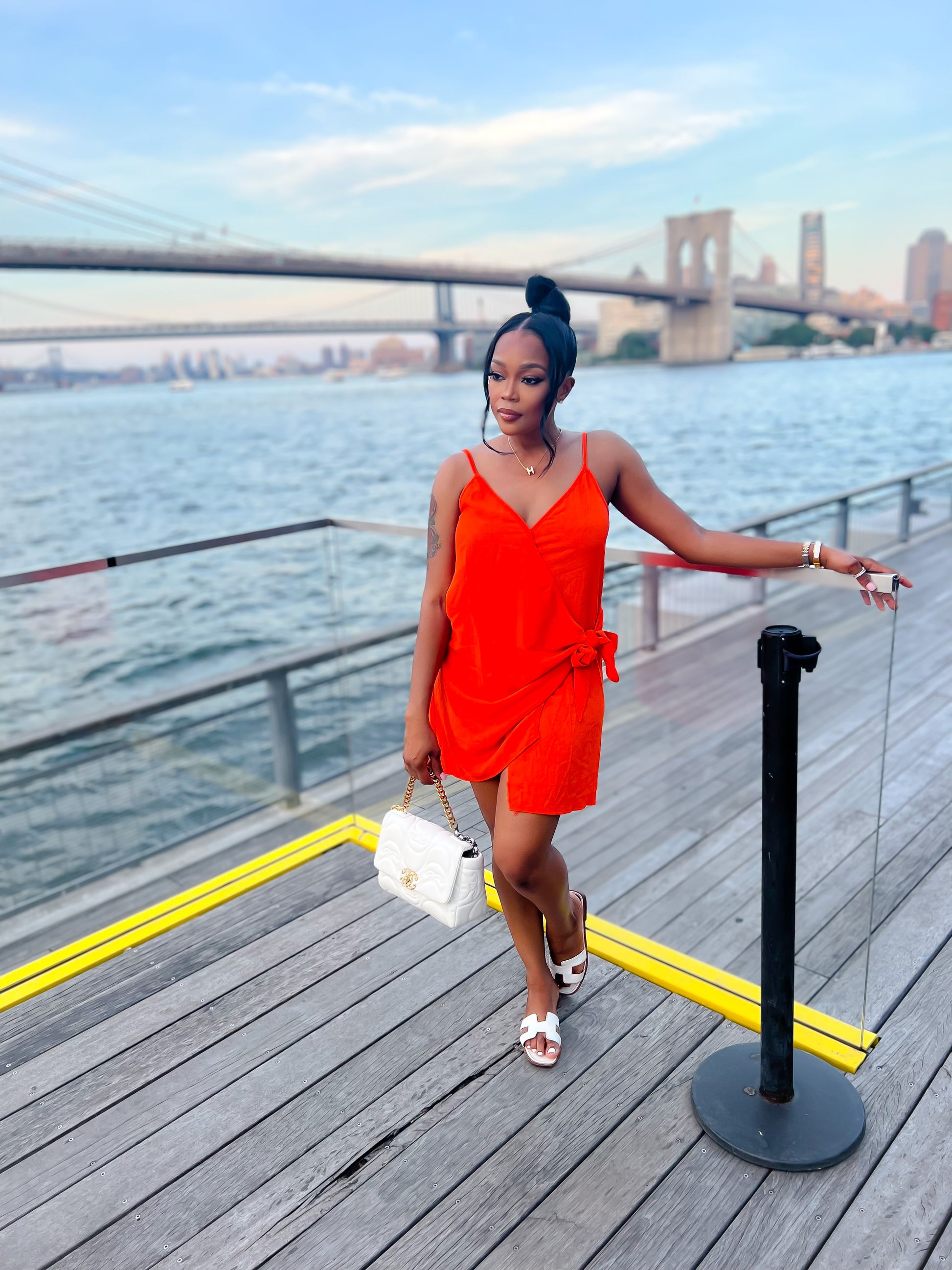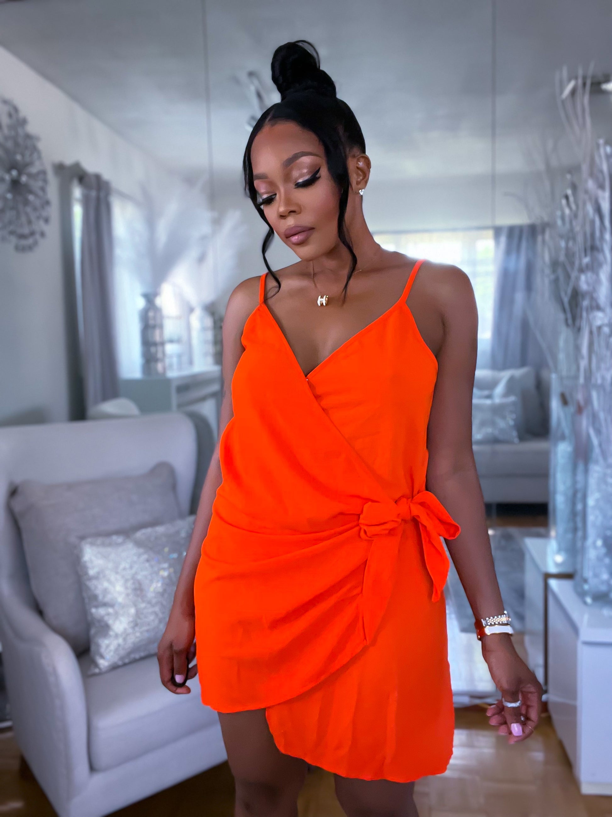 Style- adjustable spaghettini strap wrap dress with tie side detail