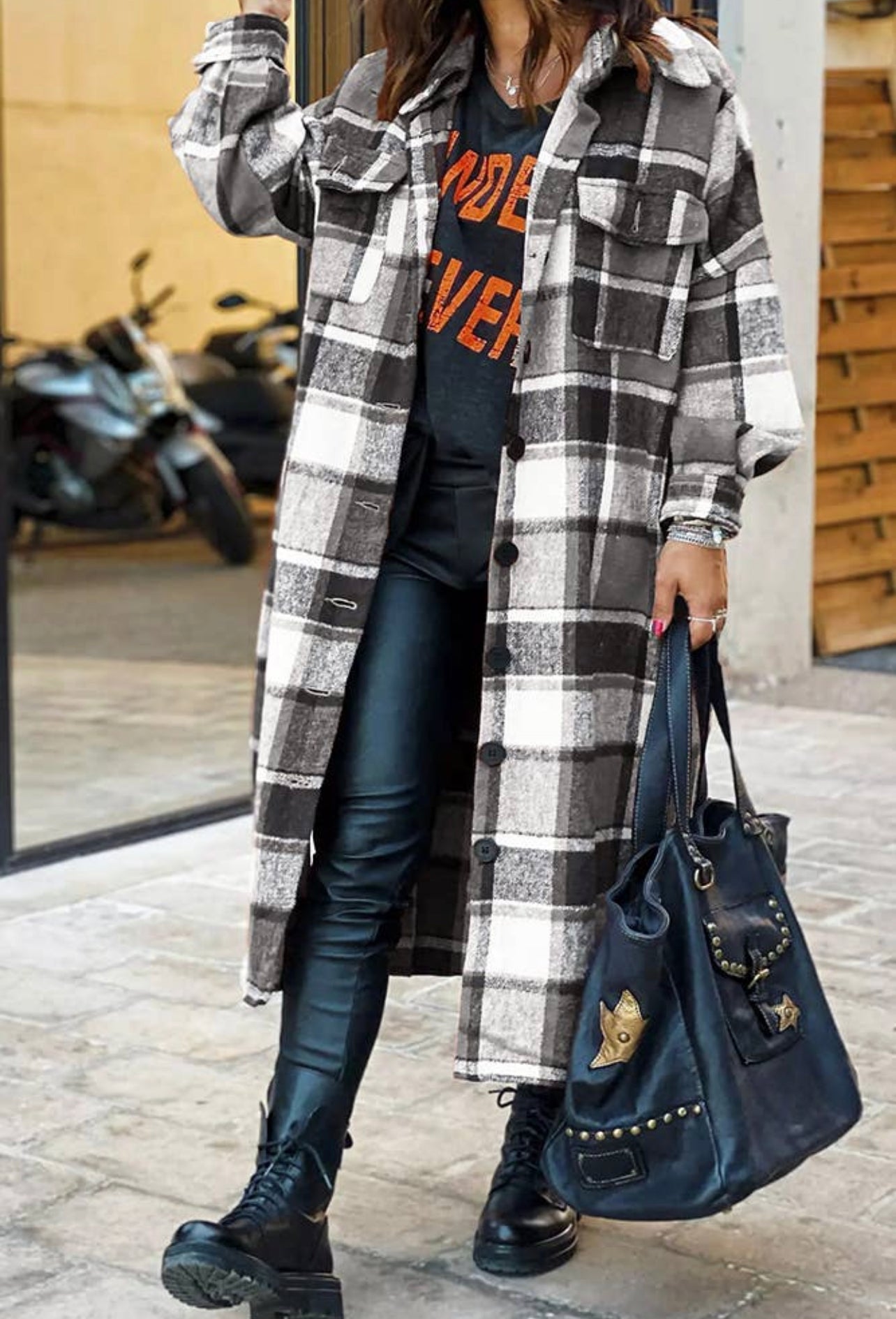This flannel maxi cardigan jacket will keep you warm while giving city street style chic.