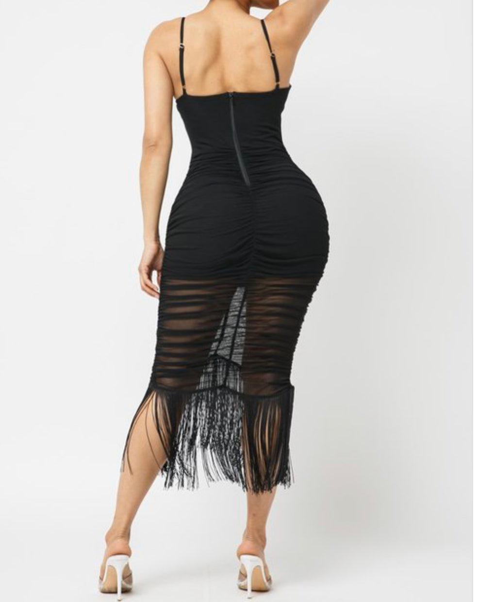style- ruched body con fit, with fringe hemline and zipper back closure